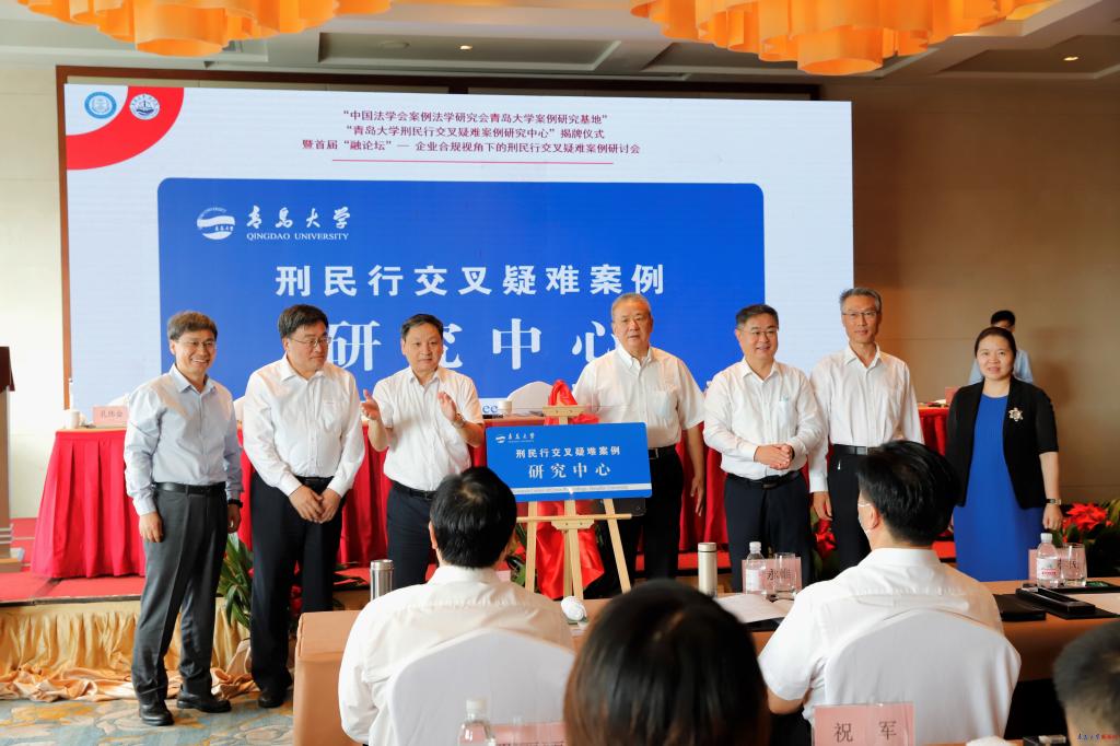 梁欣宣讀青島基地成立決定。胡云騰、夏東偉、梁欣、李方民、孫友昌、萬振東、牛傳勇共同為中國法學會案例法學研究會青島大學案例研究基地和青島大學刑民行交叉疑難案例研究中心揭牌。