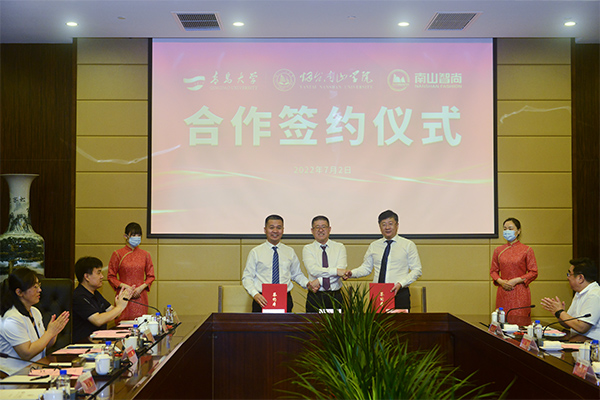 簽約儀式上,劉彩云、王玉海共同簽署《青島大學—南山控股戰略合作協議》,紡織服裝學院與煙臺南山學院、南山智尚科技股份有限公司共同簽署三方合作協議。