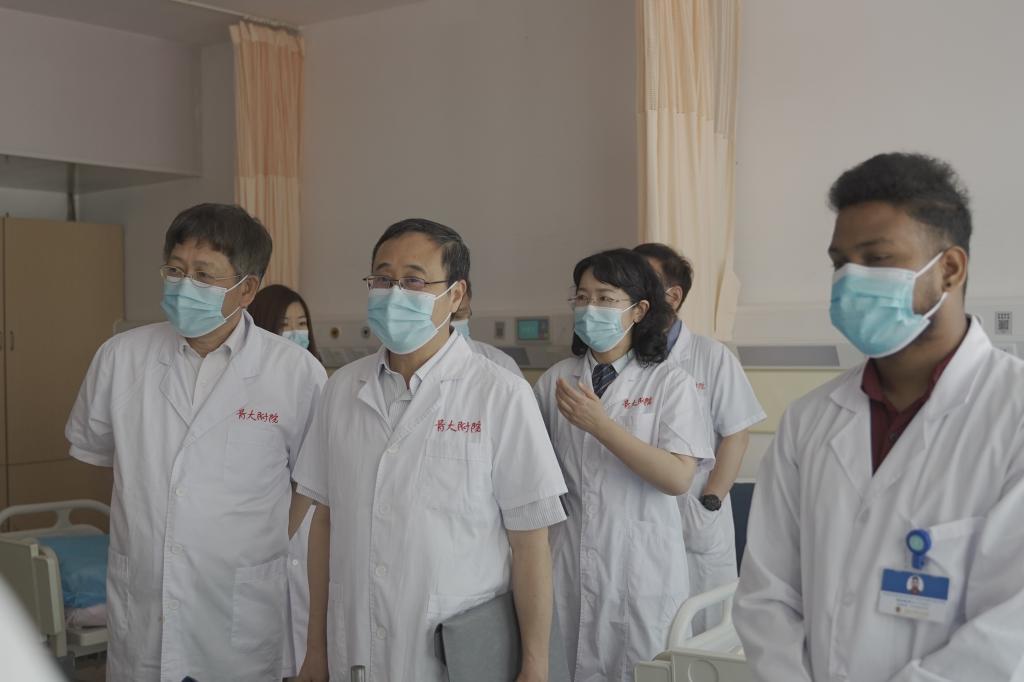 現場審查期間,專家組訪談了學校分管校領導、留學生管理人員代表、教師代表和留學生代表,深入了解留學生教學管理情況;走訪了校史館、醫學部、心理中心、附屬醫院,查看了留學生宿舍等生活環境;查閱了留學生招生、教學、管理等相關檔案;現場觀摩了《中國概況》課堂教學和臨床醫學專業留學生的附屬醫院實習。