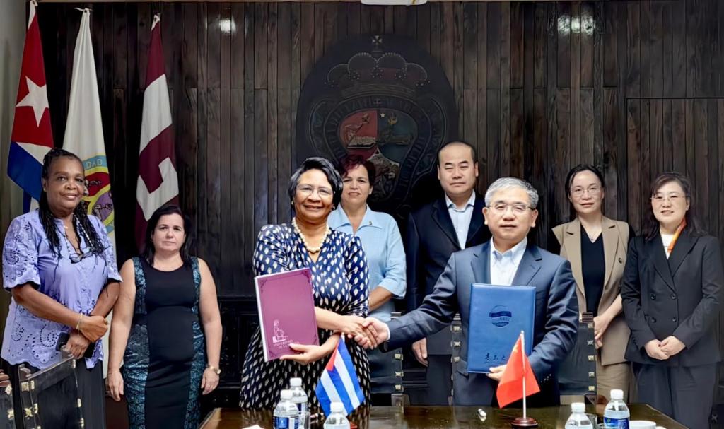 在古巴哈瓦那大學訪問期間,胡金焱與該校校長加西亞(Miriam Nicado Garcia)舉行了工作會談,并簽署了合作框架協議,為兩校進一步合作奠定基礎。雙方在會談中介紹了兩校發展情況,就教育合作、人才培養和科研合作進行了探討,雙方決定在藥學、化學和材料等領域探索開展科研合作,共同發表論文、合作申報國際科研項目。雙方還將相互支持對方西班牙語和國際中文教育學科建設,加強教學方法研討和教學資源的支持和交流。雙方同意創造條件推動教師和學生的訪問交流,同意合作開展政黨研究,合作開展對中國社會經濟問題研究和古巴問題研究,推動中古命運共同體建設。