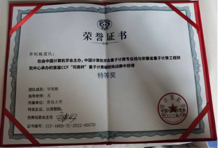 新聞網訊 8月20日晚,首屆CCF“司南杯”量子計算編程挑戰賽頒獎典禮在鄭州市首屆CCF量子計算大會期間成功舉辦,我校自動化學院畢則棟老師獨立參加了本賽事,并斬獲生物化工賽道特等獎。