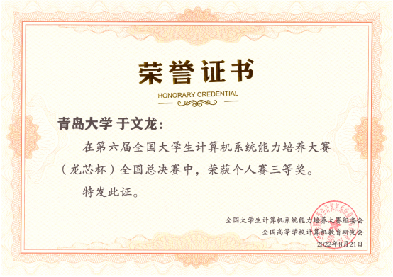 新聞網訊 近日,第六屆“龍芯杯”全國大學生計算機系統能力培養大賽在天津大學落下帷幕,來自全國百余所知名高校的優秀選手進行了激烈角逐。我校計算機科學技術學院2020級圖靈創新班學生于文龍憑借優秀的CPU設計過關斬將,順利進入大賽總決賽,最終榮獲全國三等獎,指導老師劉純毅副教授榮獲優秀指導教師稱號。此次獲獎,實現了我校學生在全國計算機系統能力競賽CPU硬件系統綜合設計領域的突破。