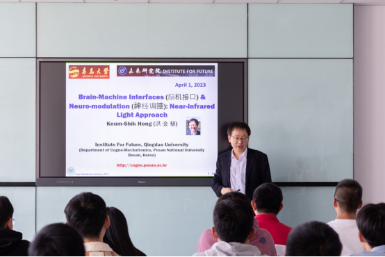 洪金植介紹了“認知機電”的新領域,尤其是腦神經信號的生物原理,以及如何利用功能性功能性近紅外光譜技術(functional near - infrared spectroscopy , fNIRS)對腦部區域信號進行檢測。借由腦機接口技術,可以實現神經退行性疾病的早期診斷,并根據腦信號模式特征,針對性開展直流/交流電流的非侵入式腦刺激方法,刺激腦部相關區域,使處在非正常退化現象的腦細胞恢復到正常水平,以此來解決藥物治療智能將神經退行性疾病短暫延遲的局限問題。報告語言生動、脈絡清晰,與在場師生進行了交流探討。