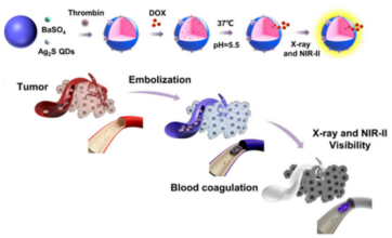 經(jīng)導(dǎo)管動脈栓塞術(shù)在腫瘤介入治療中有巨大作用。本研究報道了一種基于明膠的栓塞微球,具備NIR-II熒光成像和X射線成像雙重成像功能。將DOX裝入微球內(nèi)部,并鍵合凝血酶協(xié)同治療腫瘤。我校博士生高鳳苑與碩士生韓婷婷為第一作者,生物醫(yī)用材料與工程研究院為第一通訊單位。(全文鏈接:https://doi.org/10.1021/acsmaterialslett.3c00164)