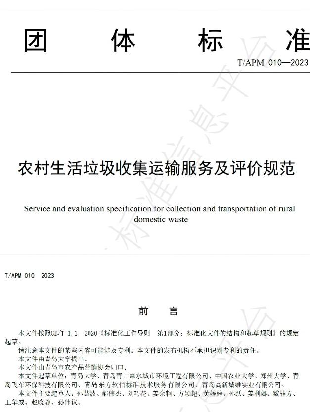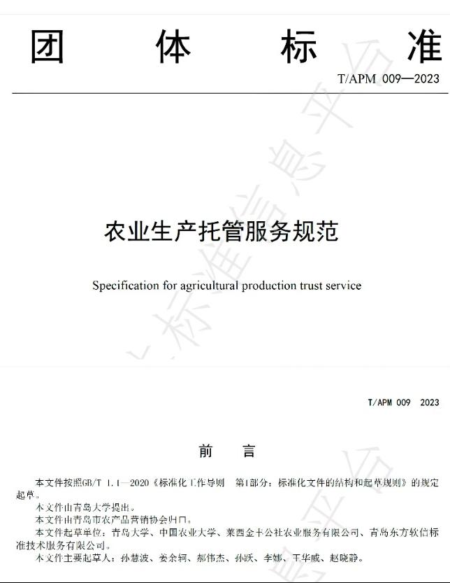 針對“誰來種地”“如何種地”和農村生活垃圾治理等農業農村領域關鍵難點問題,質量與標準化學院孫慧波團隊在實地調研的基礎上,聯合中國農業大學、鄭州大學、青島青山綠水城市環境工程有限公司、萊西金豐公社農業服務有限公司、青島東方軟信標準技術服務有限公司、青島高新城維實業有限公司等相關機構專家,起草完成了《農業生產托管服務規范》和《農村生活垃圾收集運輸服務及評價規范》兩項團體標準,并于12月8日正式在團標網備案發布(標準編號分別為T/APM 009—2023和T/APM 010—2023)。