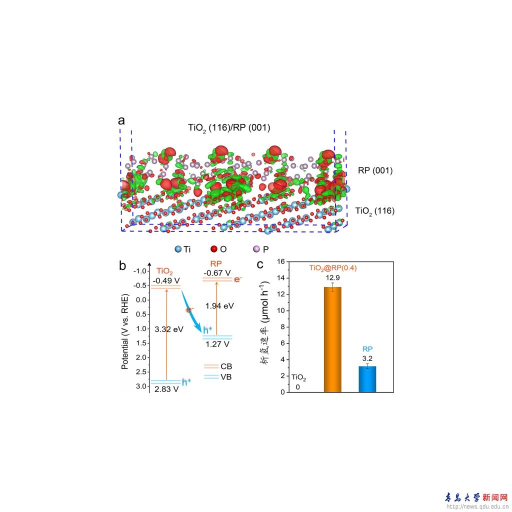 該研究針對紅磷光催化劑電荷傳輸速率低導致光催化效率受限的關鍵問題,將紅磷納米層通過化學氣相沉積策略負載于(116)高指數面暴露的氧化鈦上,構建了具有直接Z型電荷傳輸機制的氧化鈦/紅磷異質結材料。氧化鈦和紅磷之間的強界面相互作用形成的內建電場驅動光生電荷的定向遷移,使得紅磷的導帶和氧化鈦的價帶分別保留了具有高氧化還原能力的光生電子和空穴,進而提升光催化分解水析氫效率,為設計高效光催化材料提供了新思路。