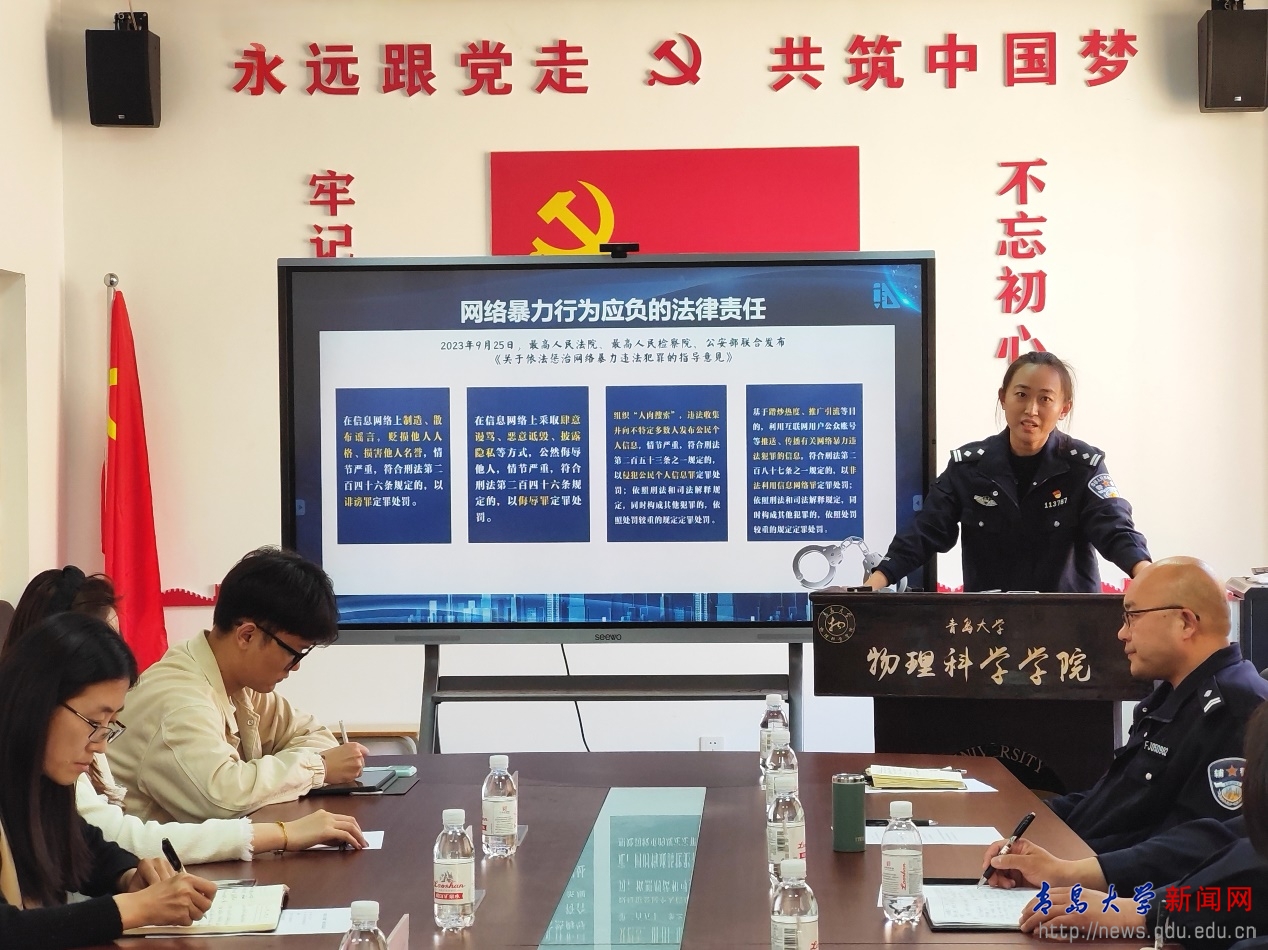 新聞網訊 為積極踐行總體國家安全觀,深入開展國家安全和網絡安全宣傳教育,在第九個“全民國家安全教育日”到來之際,4月11日下午,我校物理科學學院聯合黨委宣傳部、黨委學生工作部、黨委保衛部在浮山校區博逸樓401舉辦“國家安全 青春挺膺”國家安全普法教育活動,并在黨委保衛部110會議室舉行國家安全暨網絡安全校警聯動工作研討會。活動特邀青島市公安局網警支隊、嶗山區委網信辦、嶗山公安分局網警大隊、麥島派出所警官授課。嶗山區委宣傳部、青島市公安局警方代表、學校相關部門負責人和物理科學學院師生代表100余人參加。