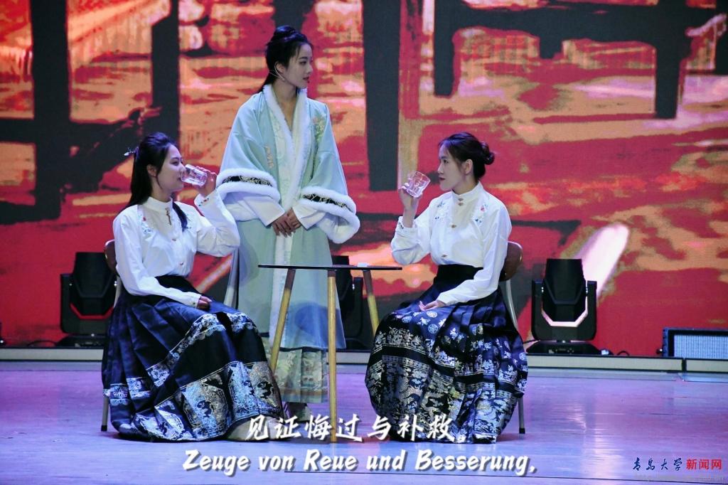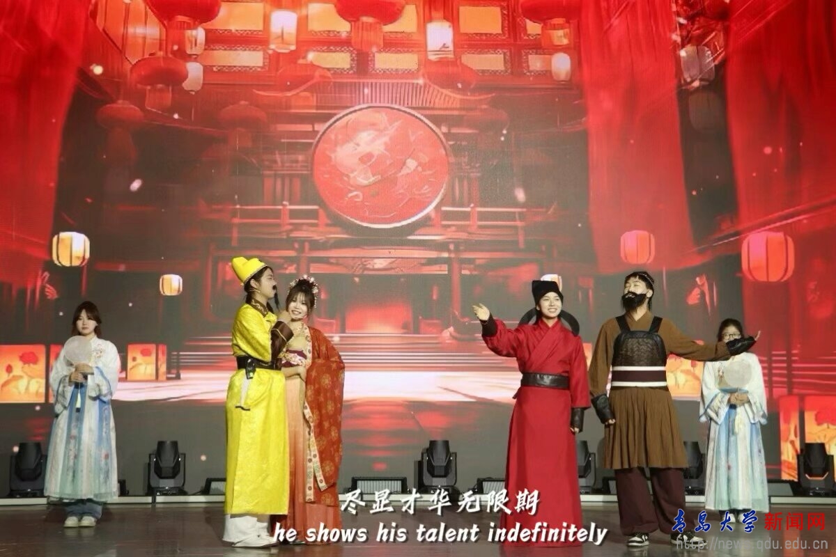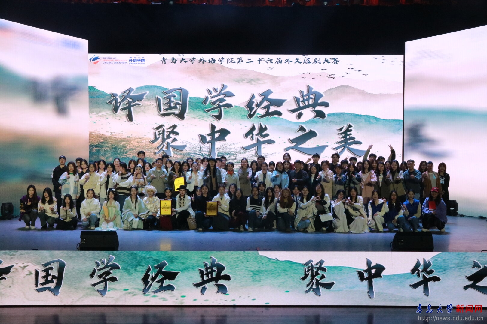 新聞網訊 4月23日晚,外語學院第二十六屆外文短劇大賽在青大劇院隆重舉行。本次大賽以“譯國學經典,聚中華之美”為主題,旨在通過多語種演繹,深入挖掘傳統文化的奧秘,展現傳承傳統文化的力量。
