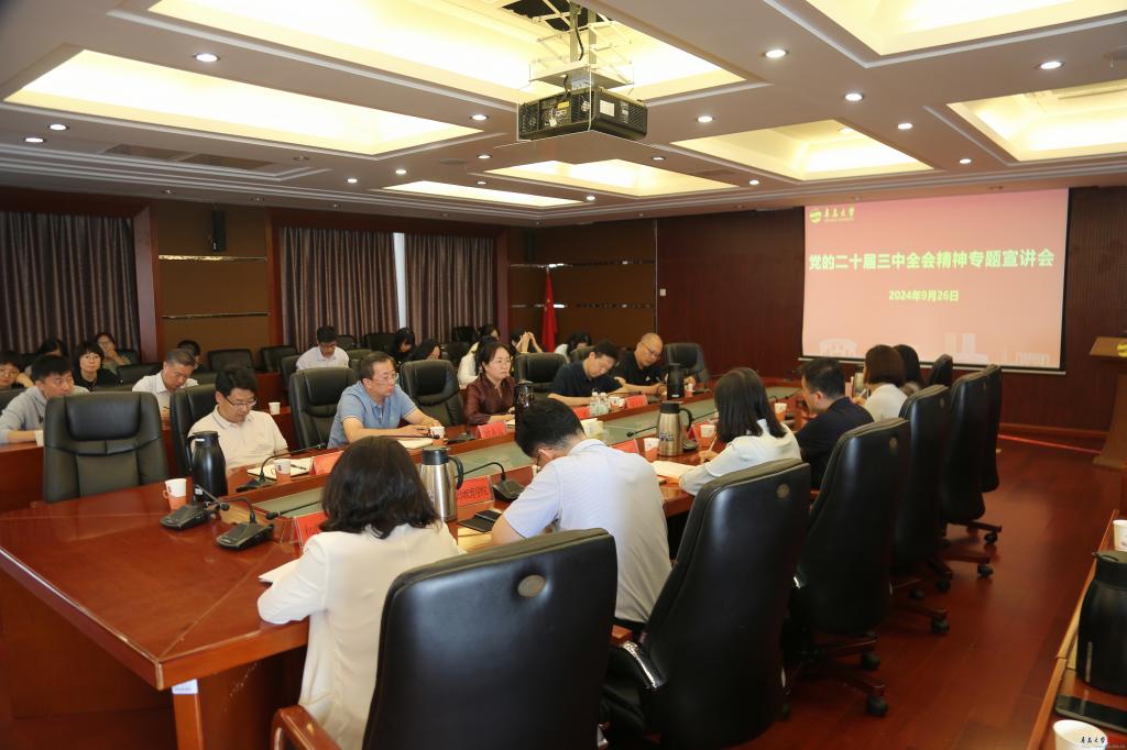 新聞網訊 9月26日,校黨委常委、副校長何燕在辦公樓407會議室為分管職能部門和聯系學院宣講黨的二十屆三中全會精神。